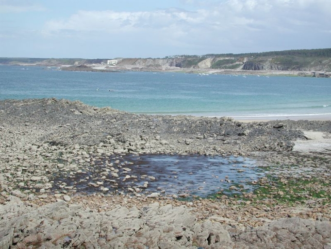 Vue générale d'une ancienne pêcherie ou écluse en pierre, à l'ouest de la plage des Sables-d'OrImmatriculation