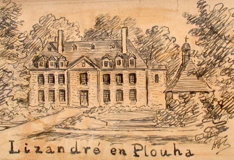 Vue générale du château et de la chapelle de Lisandré au début du 20ème siècle d'après un croquis du vicomte Henri Frotier de La Messelière (AD 22)Immatriculation
