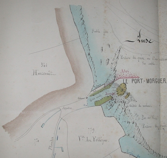 Plan de détail de Port-Morguer, dressé en 1879 : le port encombré de rochers et de galets, le ruisseau, l'aqueduc, la nouvelle jetée abri réclamée (AD 22)Immatriculation