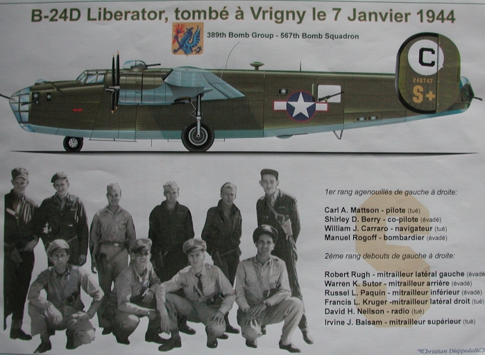 L'avion B 24D Liberator, tombé en 1944, dont 4 aviateurs furent hébergés dans la maison d'Anne Ropers à Plouha (collection particulière)Immatriculation