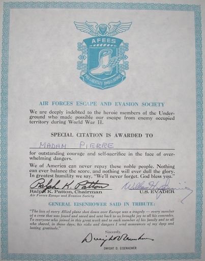 Citation en faveur de Marguerite Pierre Le Saux, de l'AFEES, signé par le président américain Eisenhower (collection particulière)Immatriculation