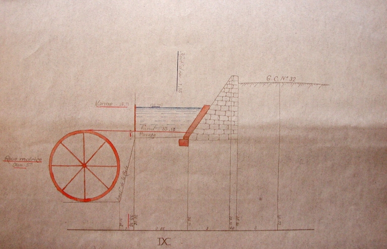 Profil en long et en travers de l'usine Gaudeau, 1918 : la vanne et la roue motrice (AD 22)Immatriculation