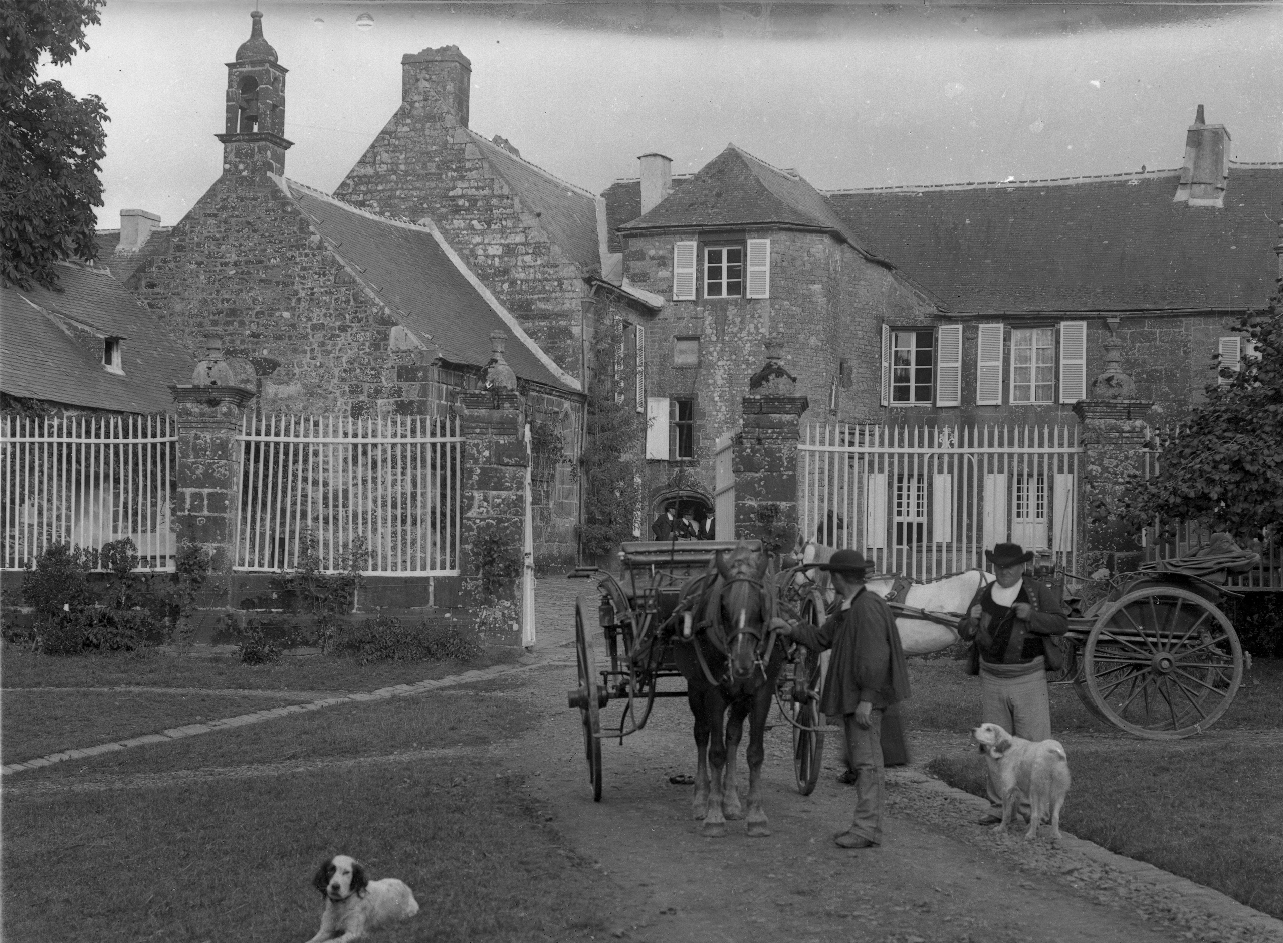 Voitures attelées devant l'entrée du manoir, vers 1900. Fonds photographique Villard (SDAP du Finistère)Immatriculation