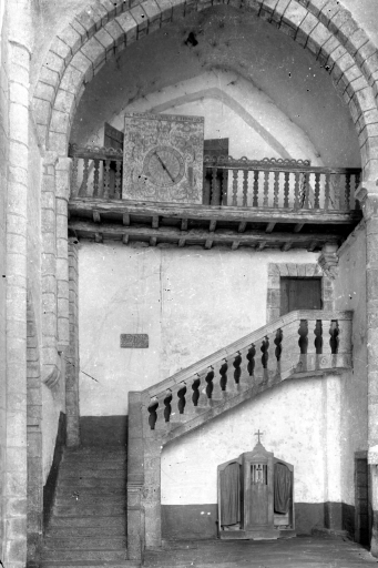 Intérieur de l'église. Escalier et tribune du transept nord. Etat vers 1890 (cl. Villard, SDAP Quimper)Immatriculation