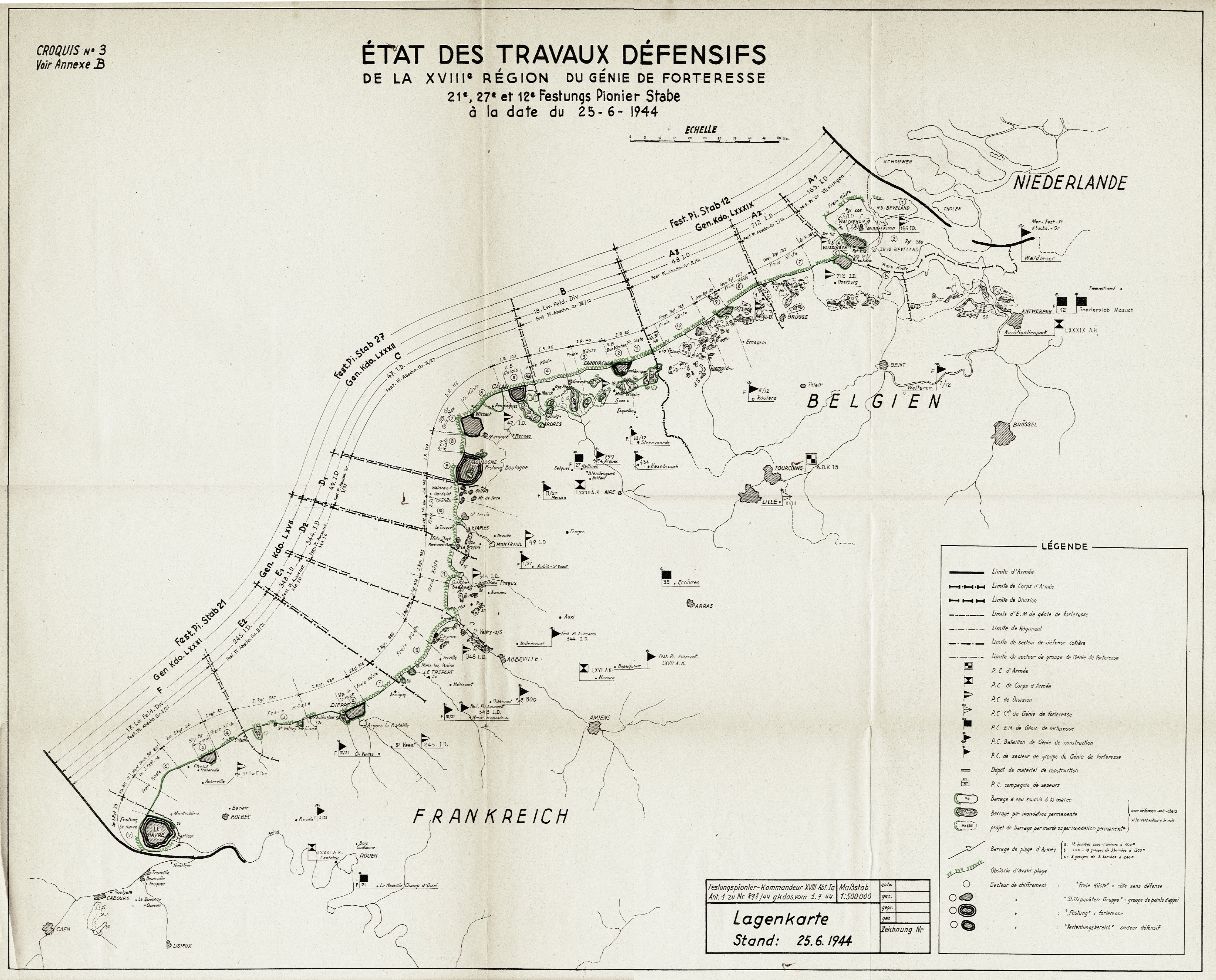 État des travaux défensifs de la XVIIIe région du génie de Forteresse (21e, 27e et 12e Festungs Pionier Stäbe) à la date du 25 juin 1944, croquis n° 3 (voir annexe B)Immatriculation