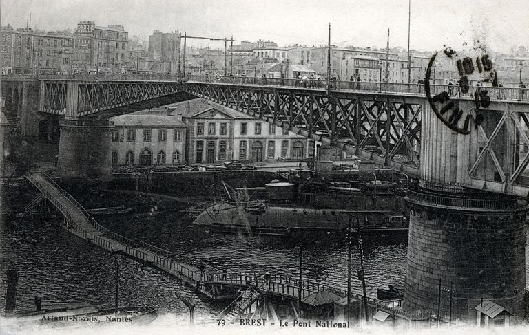 Vue de l'arsenal de Brest et du pont tournant (fermé). En arrière plan : le boulevard de la Marine au niveau des quais, le boulevard Thiers et la ville. Carte postale antérieure à 1915 (Artaud et Nozais, Nantes)Immatriculation