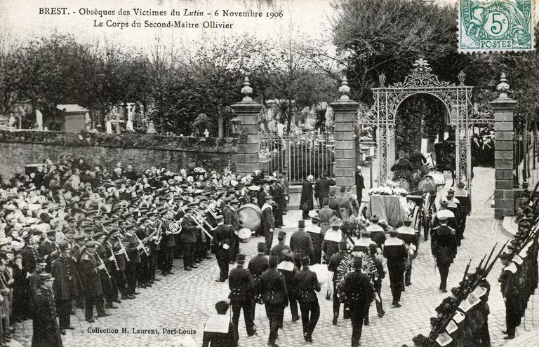 La ville de Brest vie au rythme de l'arsenal : Obséques des victimes du Lutin, le corps du second-maître Ollivier, 6 novembre 1906. Carte postale (Collection H. Laurent, Port-Louis)Immatriculation