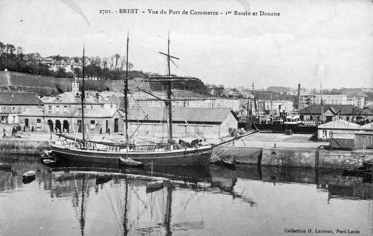 Vue de Brest : le port de commerce. En arrière plan : le Cours Dajot. Carte postale (Collection H. Laurent, Port-Louis)Immatriculation