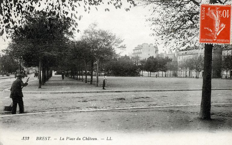 Vue de Brest : la place du château, carte postale (L.L.)Immatriculation