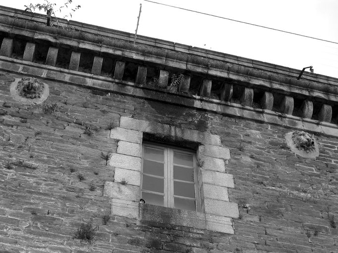 Détail de la façade orientale : corniche surmontée de réservoirs, gargouilles ornées de tête de lion et fenêtre rectangulaire du premier étageImmatriculation