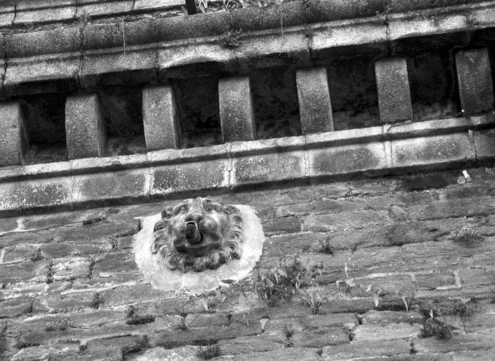 Détail de la façade orientale : l'une des dix gargouilles ornées de tête de lion et cornicheImmatriculation