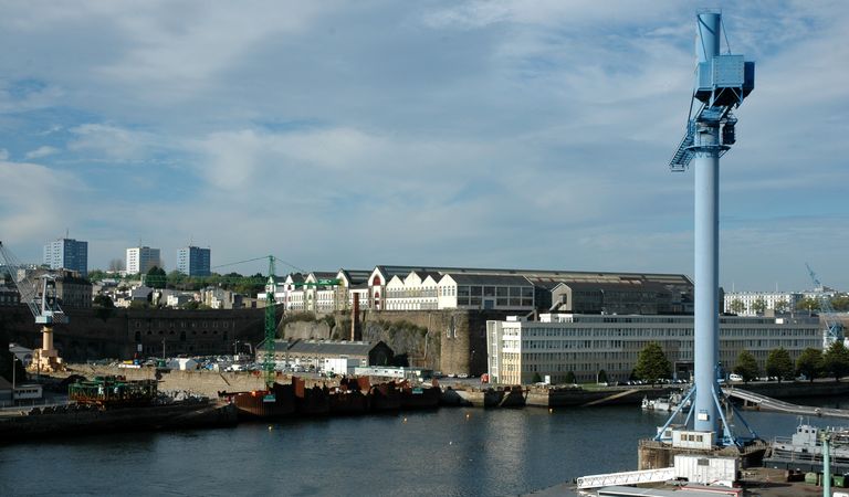 Vue de l'arsenal de Brest : les formes de Pontaniou sont en cours de modernisation. En arrière-plan : le plateau des Capucins en cours de reconversionImmatriculation