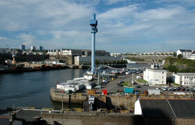 Vue générale de l'arsenal de Brest : les formes de Pontaniou sont en cours de modernisation. En arrière-plan : le plateau des Capucins en cours de reconversionImmatriculation