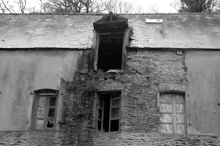 Vue de détail du bâtiment B en 2005 : fenêtres rectangulaires avec linteaux en arc surbaissé et droit (au centre) et lucarne pendanteImmatriculation