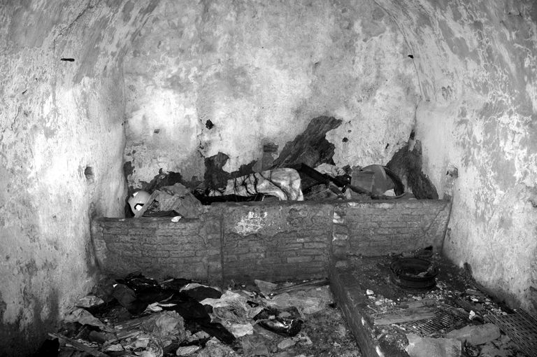 Vue d'un espace troglodytique voûté aménagé dans la micro-falaise (état en 2005) : au fond, triple "auge" en brique (espace à usage d'étable ou de soues à cochon ?)Immatriculation