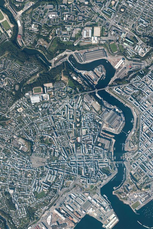 Vue aérienne verticale de la Penfeld : de la Cavale Blanche à la rade de Brest, Brest Métropole OcéaneImmatriculation