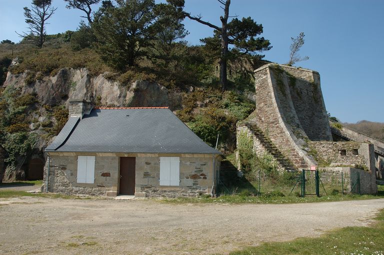 Vue du fort du Mengant : bâtiment couvert à deux pans à coyaux en ardoises et renseigné en 1696 comme logements des canonniers, halle et corps de gardeImmatriculation