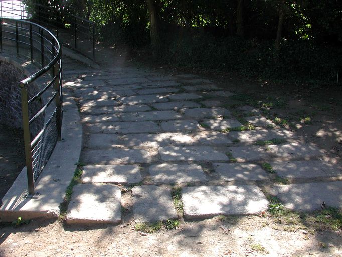 Vue du fort du Dellec : détail du pavage de la rampe surmontant le poste de projecteurImmatriculation