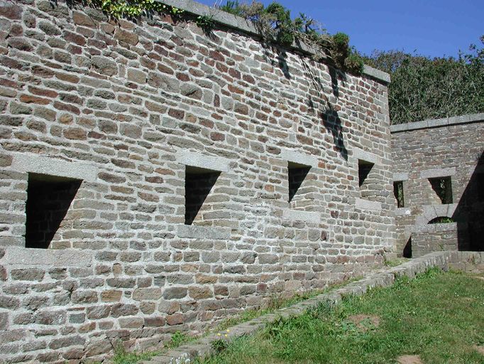 Vue du fort du Dellec : mur d'enceinte ouest percé de créneaux de fusillade. Bastionnet à mâchicoulis ou créneaux de piedImmatriculation