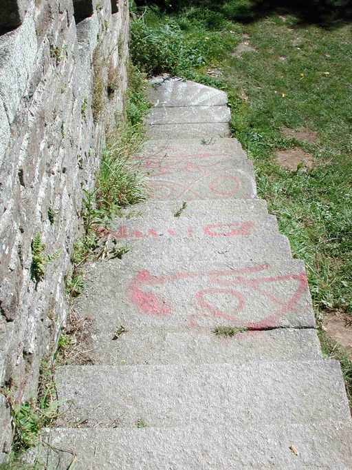 Vue du fort du Dellec : escalier du mur d'enceinte ouest percé de créneaux de fusilladeImmatriculation