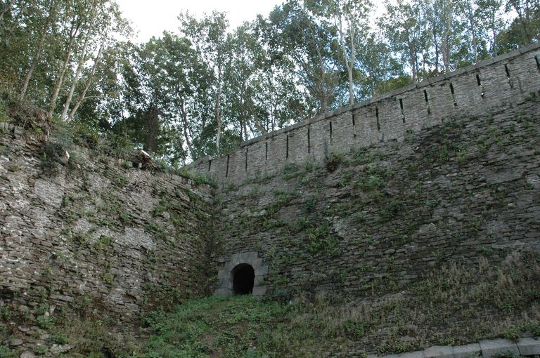 Vue de l'ouvrage à cornes de Quéliverzan : poterne débouchant dans le fossé sec surmontée de créneaux de fusilladeImmatriculation