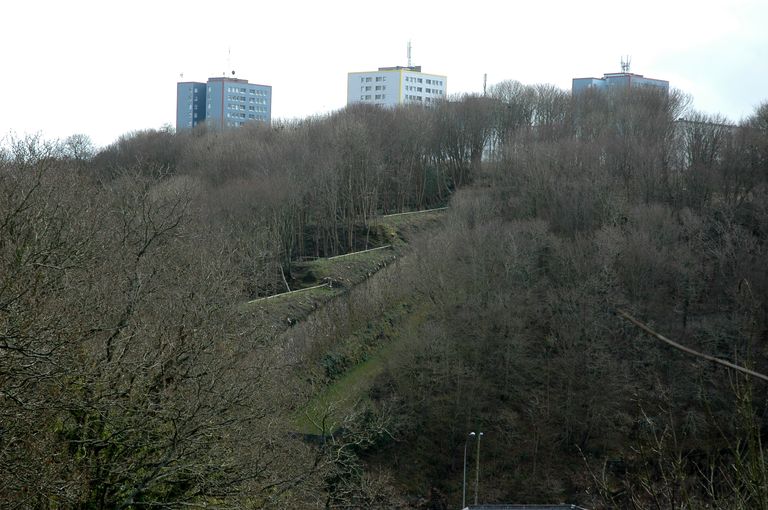 Vue de l'ouvrage à cornes de Quéliverzan depuis la rive opposée de la Penfeld : plateformes d'artillerie en escalierImmatriculation