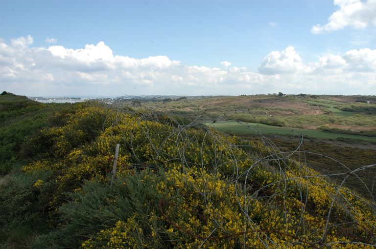Vue des lignes de Quélern : les fortifications dominent la campagne environnante vers Crozon. Le terrain en pente remplace avantageusement le glacisImmatriculation