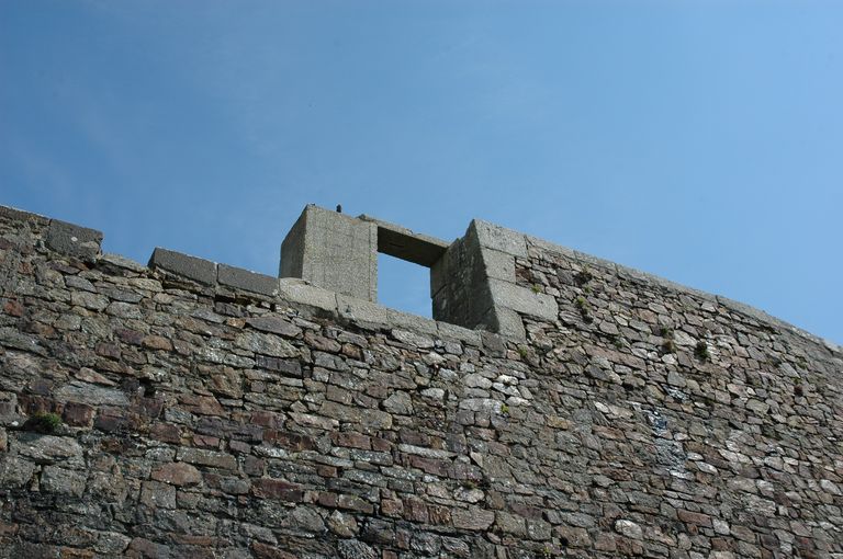 Vue des lignes de Quélern : installations allemandes (antenne : ?) situées sur le rempart couvrant l'arrière de la batterie de côte ouestImmatriculation