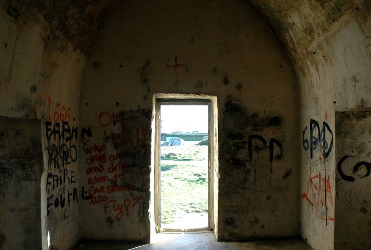 Vue intérieure du corps de garde de Guissény : voûte et porte d'entréeImmatriculation