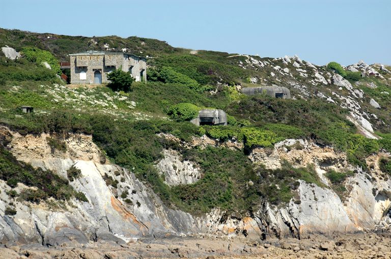 Vue de la pointe du Petit Gouin depuis l'anse de Camaret : corps de garde crénélé et batterie sous bunkers - casemates de type 671 (2 x 7,5 cm)Immatriculation