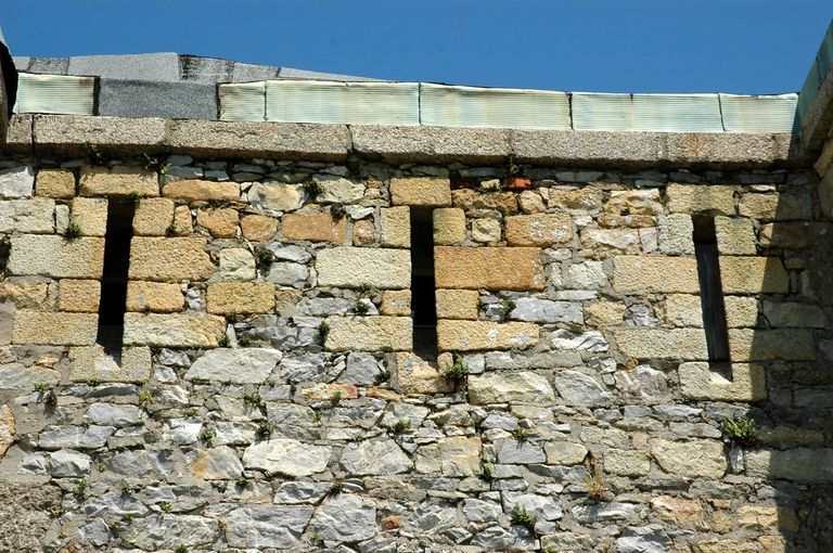Vue du corps de garde crénelé : créneaux de fusillade du parapet (état en 2005)Immatriculation