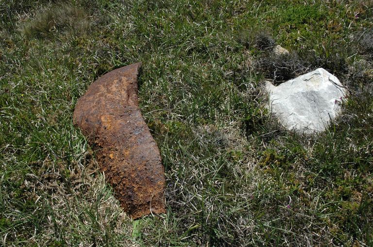 Vue d'un éclat de bombe aérienne (longueur : 90 cm environ)Immatriculation