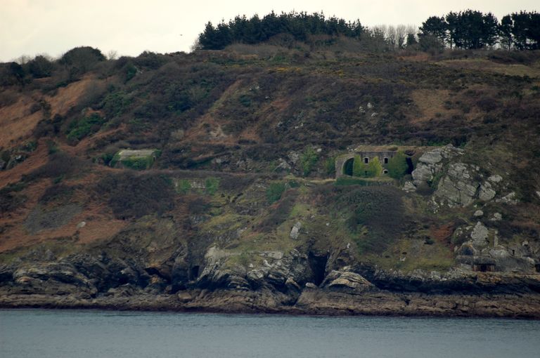Roscanvel : les fortifications de la pointe Robert depuis la mer, caserne défensive, batteries, groupe de deux projecteurs et usine électriqueImmatriculation