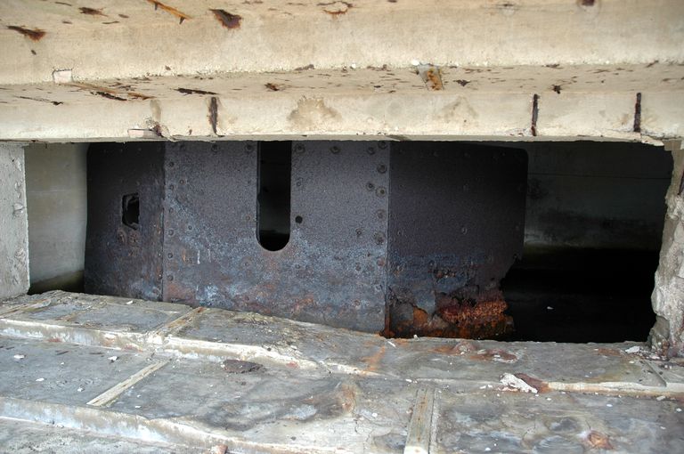Vue de la batterie de rupture de Pourjoint. Les embrasures ont été coiffées par deux casemates pour canon antichars durant la Seconde Guerre Mondiale. Masque blindé pour canon anticharsImmatriculation