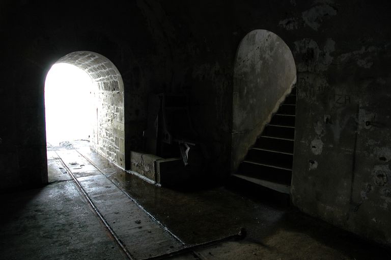 Vue de la batterie de Cornouaille : abri de projecteur (4e quart du 19e siècle) aménagée sous le mur de soutènement de la batterie (4e quart 17e siècle). A signaler : les rails pour le chariot du projecteurImmatriculation