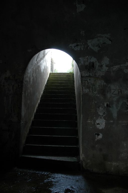 Vue de la batterie de Cornouaille : abri de projecteur (4e quart du 19e siècle) aménagée sous le mur de soutènement de la batterie (4e quart 17e siècle). Escalier permettant l'accès à la galerieImmatriculation