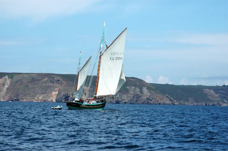 Crozon : vue générale du cap de la Chèvre depuis la mer. La Nébuleuse au portant (navire de pêche de Camaret devenu navire de plaisance à Paimpol)Immatriculation