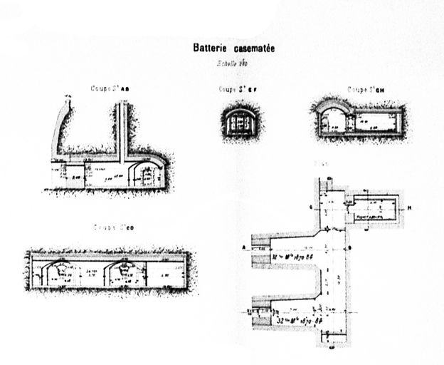 Plans et coupes de la batterie casematée de 32 cm du Minou (2 canons de 32 cm modèle 1870-1884 sur affûts M modèle 1888), Direction d'Artillerie du génie de Brest, 1893, par le colonel Directeur d'Artillerie : CollombImmatriculation