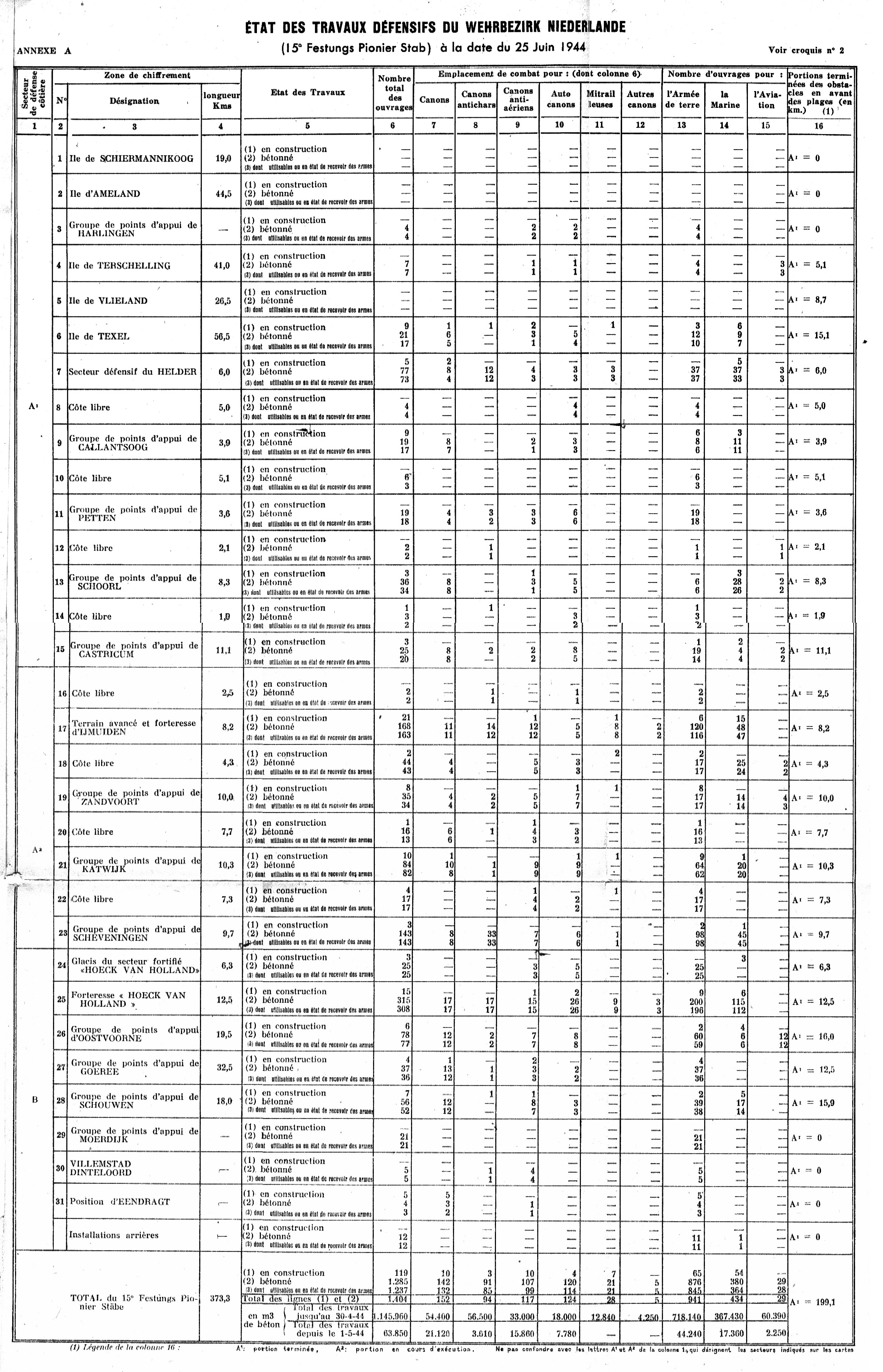 État des travaux défensifs du Wehrbezirk Niederlande (15e Festung Pionier Stab), district militaire des Pays-Bas à la date du 25 juin 1944, annexe A (voir croquis n° 2)Immatriculation