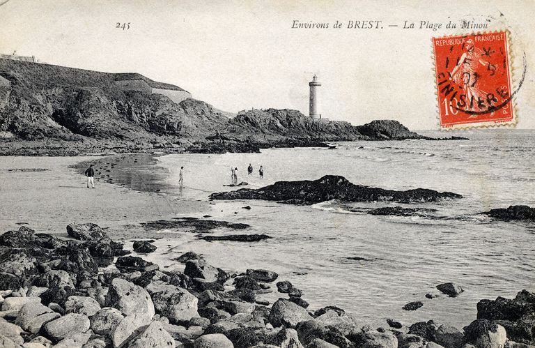 Plouzané : vue de la pointe du Minou et de la plage : fort, batterie française du 19e siècle, carte postale (245)Immatriculation