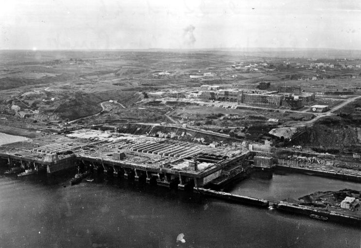 Vue aérienne oblique de la base de sous-marins et de l'école navale de Brest vers 1947 (Service historique de la Marine, extrait du rapport Pinczon du Sel, livre IV, n° 115)Immatriculation