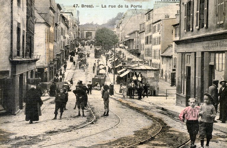 Vue du quartier de Recouvrance à Brest : rue de la porte, porte du Conquet. Carte postaleImmatriculation