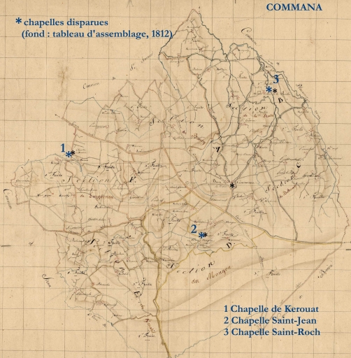 Localisation des chapelles sur fond du tableau d'assemblage de 1812 (A.D. Finistère, 3 P 108)Immatriculation