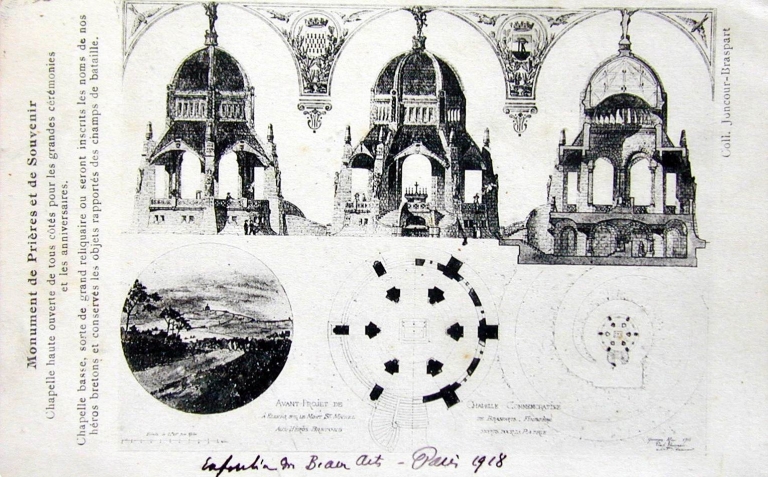 Projet de monument commémoratif aux héros bretons pour le mont Saint-Michel, par Charles Chaussepied, 1918. Carte postale (A.D. Finistère, 2 Fi 16)Immatriculation