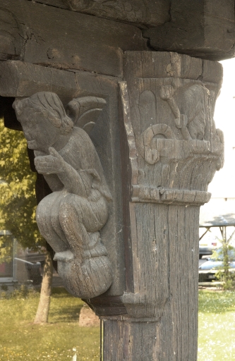 Elévation nord, travée droite, aisselier droit : ange priant, et poteau d'angle sud-est avec chapiteau feuillagé d'où émerge une tête d'homme (autre vue rapprochée)Immatriculation