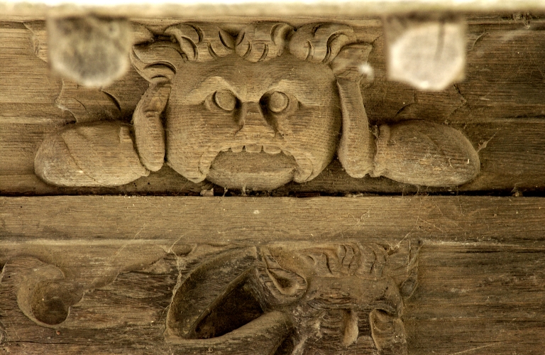 Elévation nord, travée droite, sablière : tête d'homme, de face, les mains sur les oreilles et dragon à tête d'homme (vue rapprochée)Immatriculation