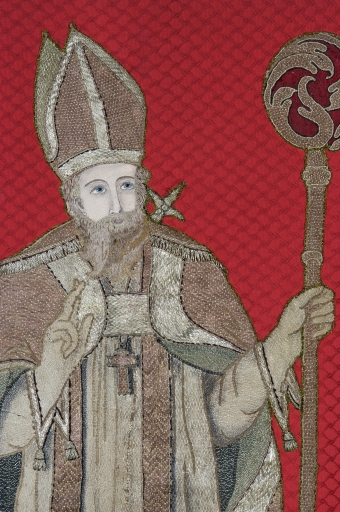 Bannière de procession paroissiale : Saint Sulpice, Christ en croix avec Marie-Madeleine,