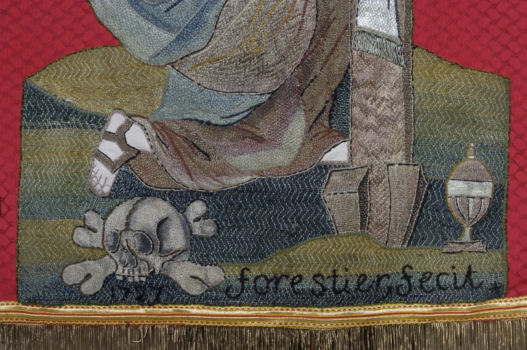 Bannière de procession paroissiale : Saint Sulpice, Christ en croix avec Marie-Madeleine,
