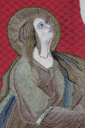 Bannière de procession paroissiale : Saint Sulpice, Christ en croix avec Marie-Madeleine,