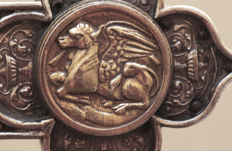 Croix de procession : avers, médaillon boeuf de saint LucImmatriculation